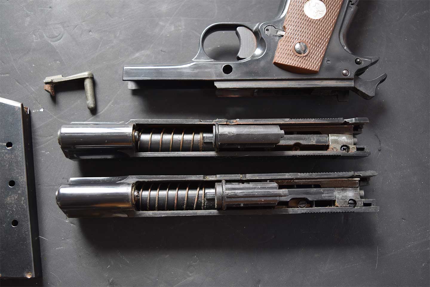 写真で気付きましたが、メインスプリング・ハウジングを外すピンは、グリップを外さないと抜けませんね。