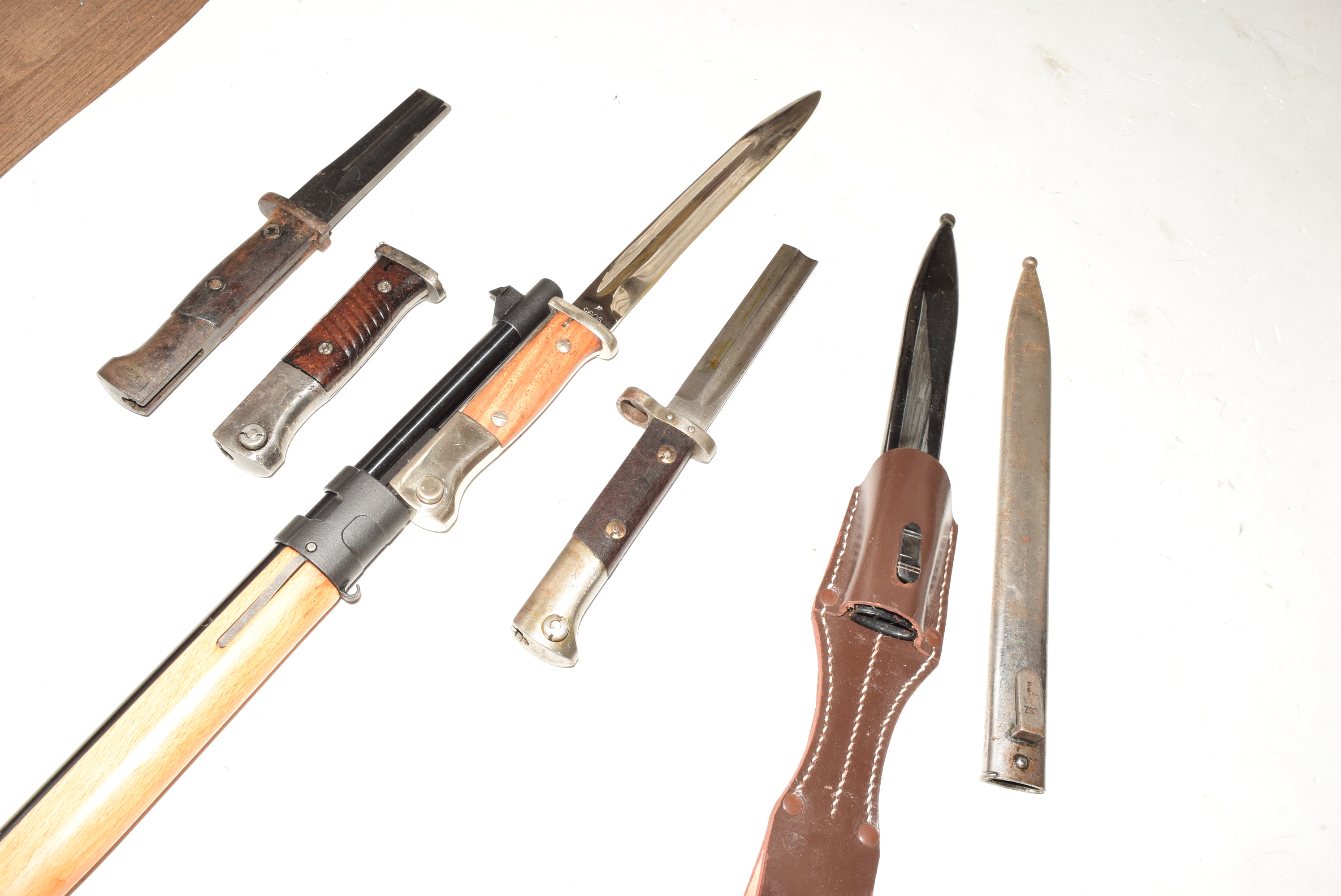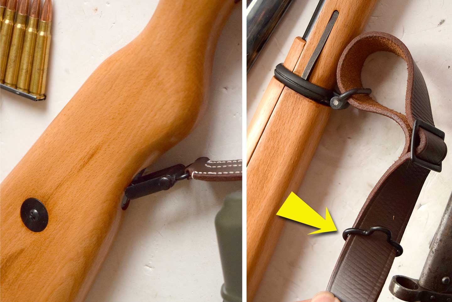 ストック先端部分の金具は、CMC モデルガンのように一体物になっています。実物は右のようにツーピースです。また、クリーニングロッドを外さなくても銃剣が入れられます。写真のすべて装着できました。装着しているのはウインドラスの模造刀で他は実物です。ツバがあるのはチェコ製です。