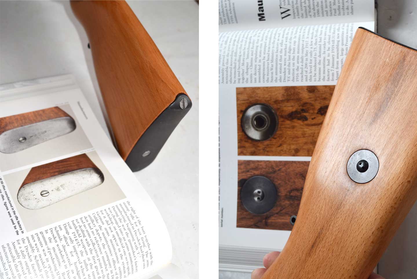 我が家のモーゼルKar98たちと比較しています。長さもですが、一般にカップ型のバットプレートしか流通していないのは、