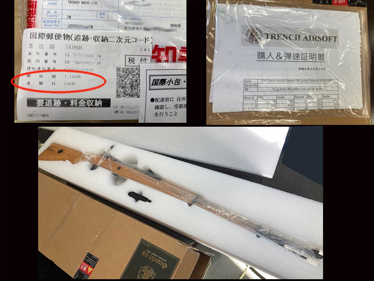 到着は日本郵便さんが持ってきました。税金で 7,300円を取られました。開封はされていないようです。表に弾速証明が貼られているのでOKなのかもしれません。中身の本体は、スポンジのような緩衝材にくるまれて横たわっています、これなら安心です。