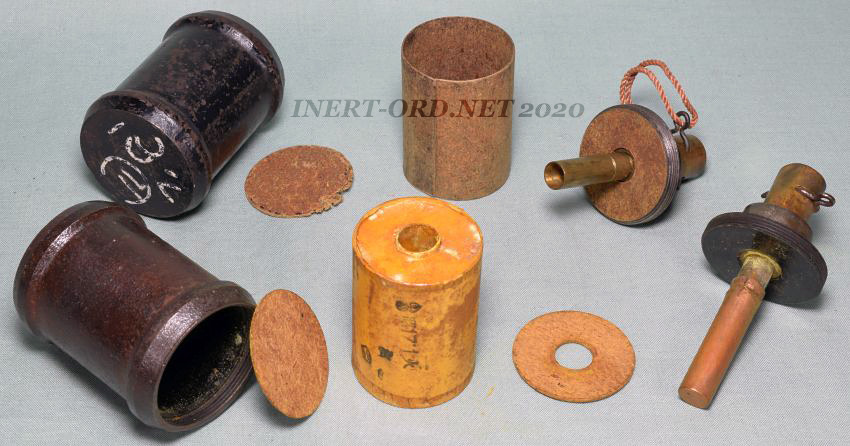 ペンキの塗り方はまちまちの様です。写真のドーナッツのようなものが爆発火薬でその右にあるのがヒューズです。安全ピンを抜いてヒューズの頭を叩くと、叩かれると発火する火薬からジワジワ燃える火薬に引火して、数秒後にドーナッツ型の火薬に引火して爆発するようになっています。
