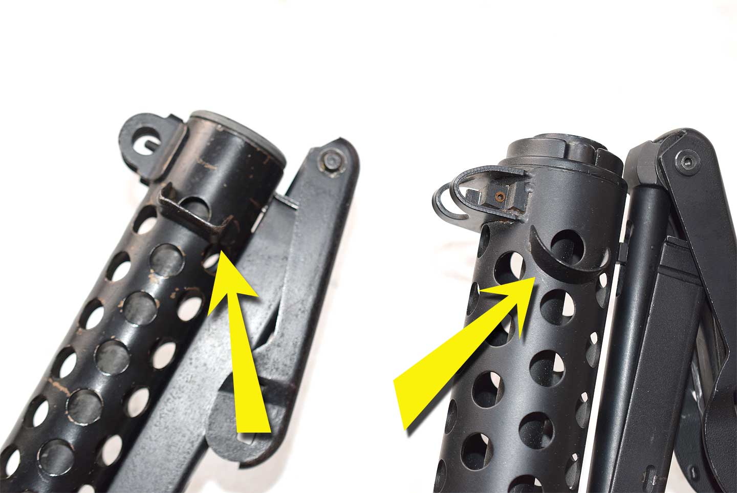 左がイギリスのスターリングで右がカナダのC1ですが、排莢口と先端部にあるハンドガードの形状が丸と四角になっています。 右写真は後で紹介するカナディアン・ミリタリ・ポリス・ミュージアムのページにあります。