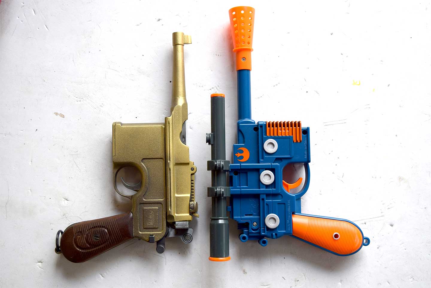 右の写真は、左が英国標準マズルの電動ガン、右がMGC モデルガン。